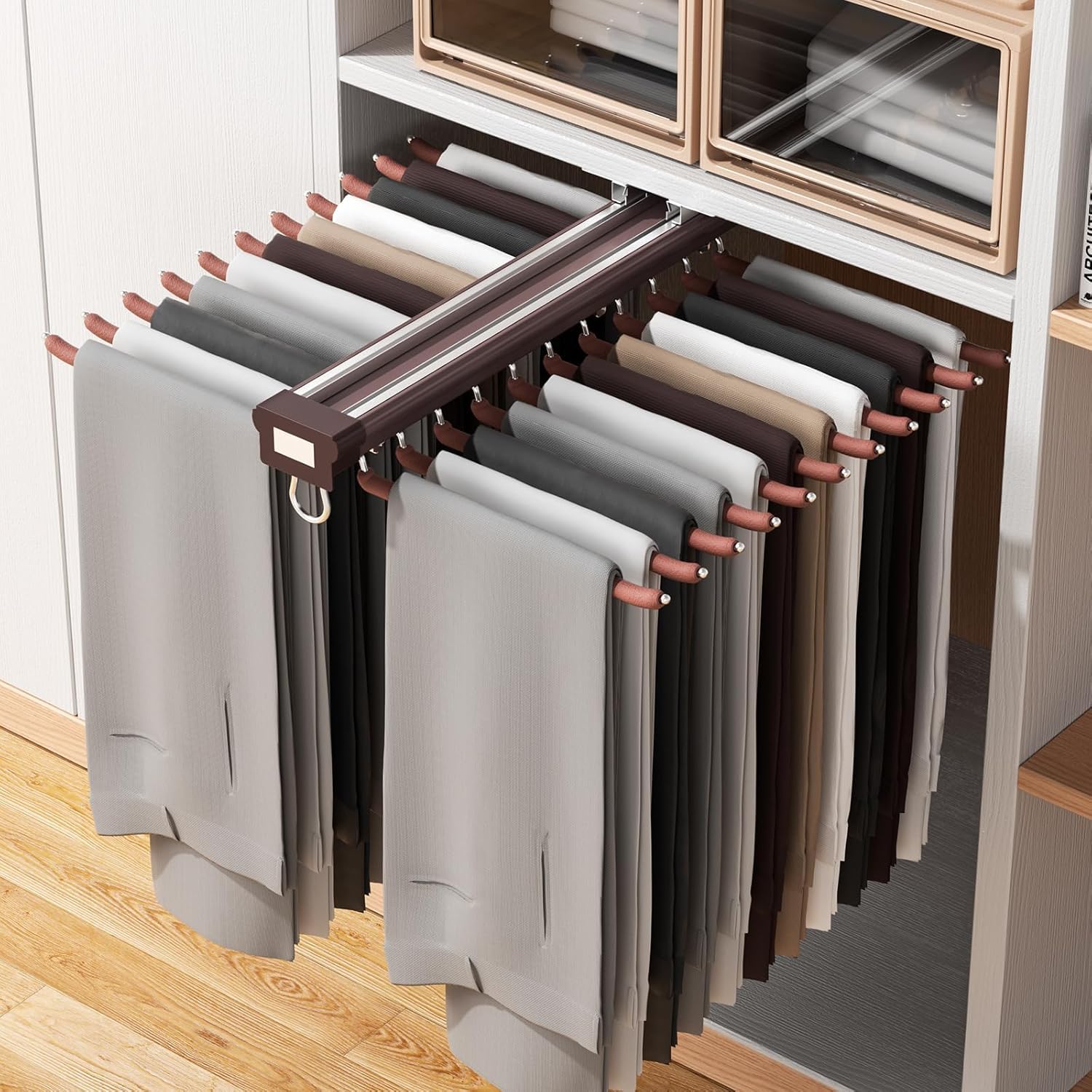 Pull-out systems keep trousers neatly arranged while making them easy to access.